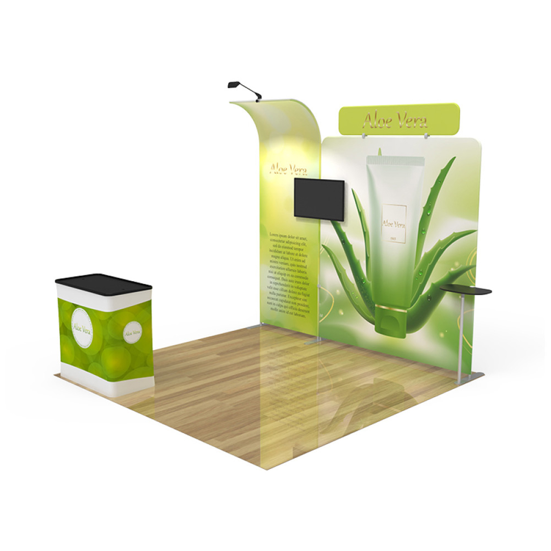 This unique booth features a combination of two flat tension fabric backwall displays, two angled tension fabric backwall displays, a brochure and literature banner stand, a television monitor display bracket, a podium (with a carrying case included), four tube columns, eight hangers, and four LED light fixtures, all crafted to effectively engage your audience.
