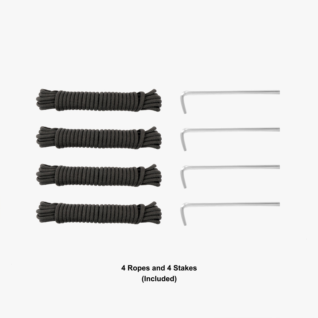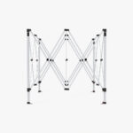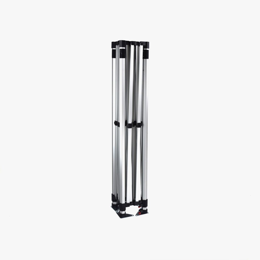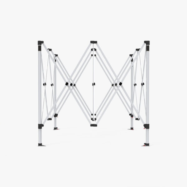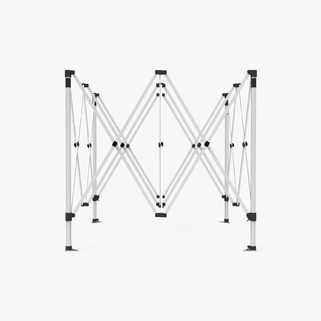 Heavy duty hex shape 40 mm. aluminum hardware gives the tent exrta strength when exhibited outdoors, our frame is a serious upgrade from steel framed tents that bend and buckle easily. Telescopic legs allow you to adjust the height, and the interior lattice expands the tent interior with the crank of a handle. Each leg has a foot plate ready to be staked to the ground. (Ropes, stakes, and standard carrying bag included with hardware).