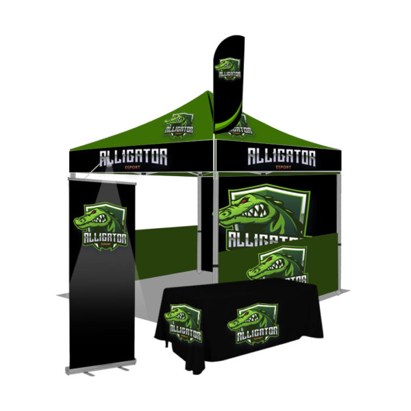 •10' x 10' full color custom tent •Heavy Duty aluminum hex frame •6 oz weatherproof tent fabric - dye sublimated •Optional printed walls and flags •Carry bag included - Premium wheeled bag available •Dye-sub printed walls on 6oz weatherproof tent fabric •Full Walls attach to event tent hardware via velcro loops •Half Walls have a top pole pocket for the half wall hardware and velcro loops for the sides •Single and Double sided available for Half Walls, Single sided only for Full Walls •UV printed fabric graphic - curl-free edges •Compact aluminum hardware with two stabilizing feet •Quick setup •Complimentary travel bag. •8.8 oz tension fabric table cover •Full color dye sub •Fits standard 6' tables •Open back for sitting behind table during exhibitions •Closed back for 360 degree table coverage •Clamp connector attaches to hex frame leg •Compatible with Feather/Teardrop flags in Small and Medium •Single and Double sided •Dye-sub printed flag material is durable for outdoor events