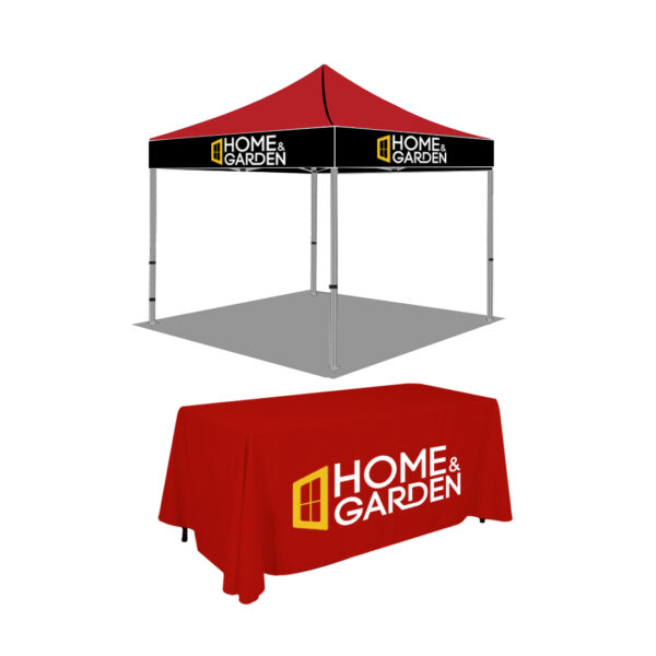•10' x 10' full color custom tent •Heavy Duty aluminum hex frame •6 oz weatherproof tent fabric - dye sublimated •Optional printed walls and flags •Carry bag included - Premium wheeled bag available •8.8 oz tension fabric table cover •Full color dye sub •Fits standard 6' tables •Open back for sitting behind table during exhibitions •Closed back for 360 degree table coverage