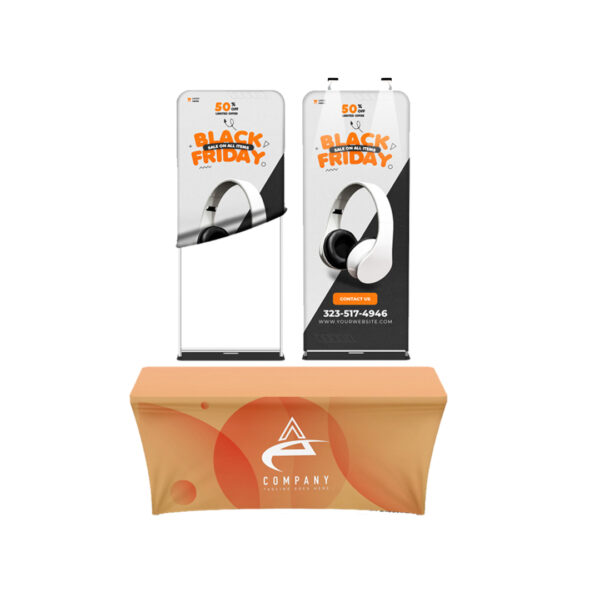 The pop-up display is so quick and easy to assemble with its pop-up mechanism. Dye sublimated tension fabric graphics come with sewn on velcro that attaches to velcro on the accordian style frame. The graphics wrap onto the side profile of this display for full coverage endcaps. Our standard table cover is a great table topper for trade shows, exhibitions and presentations. Our table covers are dye sublimated and are 100% washable if they ever get dirty. This table cover is made from our 8.8 oz. polyester table fabric sized for a 72″ x 30″ x 30″ display table. The table cover is sewn with rounded corners and hang approximately 2″ above the floor. The back side of this table cover is open keeping the leg area open for sitting exhibitors.