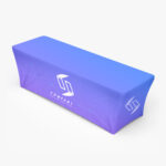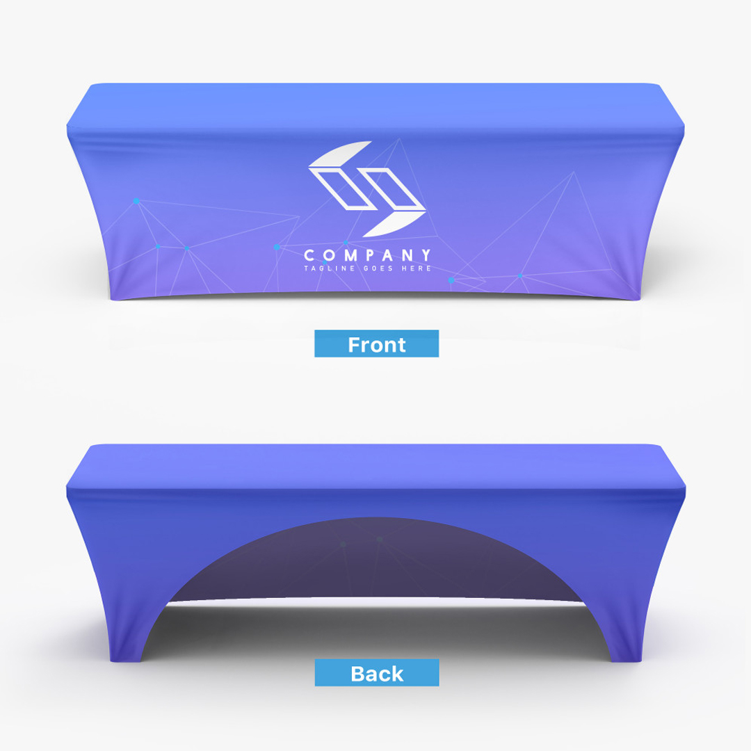This modern update to the standard table cover is sleek and a total attention grabber. The tension fabric table cover fits snug to most 8FT collapsible tables, and is perfect for a variety of trade show and event table setups. The table cover is a fully customizable dye-sublimation graphic print. Full color design will make your graphics pop. Customize the background, front, and both sides of the cover with your company name or logo. The included canvas loops secure the cover to each leg during install for easy setup. Stand out above the rest with this professional and modern style table cover. FEATURES: High resolution full color digitally printed at 720 x 720