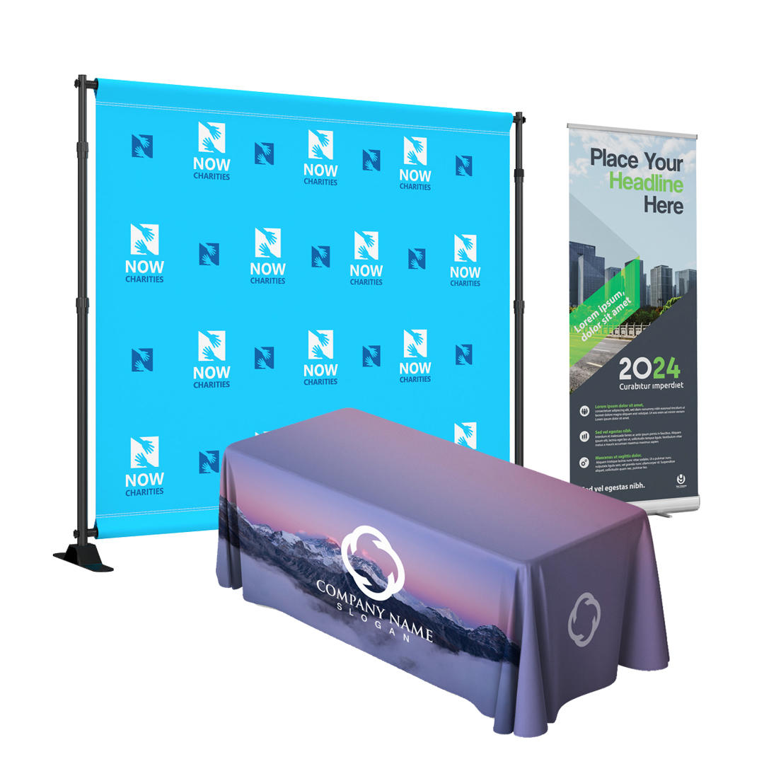 •Large tube hardware - more durable than the competition •Adjustable height and width •Dye sub graphics are easy to install and replace •Low sheen fabric is great for photo backdrops •Complimentary carrying bag •Single sided only •10' x 10' full color custom tent •Heavy Duty aluminum hex frame •6 oz weatherproof tent fabric - dye sublimated •Optional printed walls and flags •Carry bag included - Premium wheeled bag available •UV printed fabric graphic - curl-free edges •Compact aluminum hardware with two stabilizing feet •Quick setup •Complimentary travel bag •8.8 oz tension fabric table cover •Full color dye sub •Fits standard 6' tables •Open back for sitting behind table during exhibitions