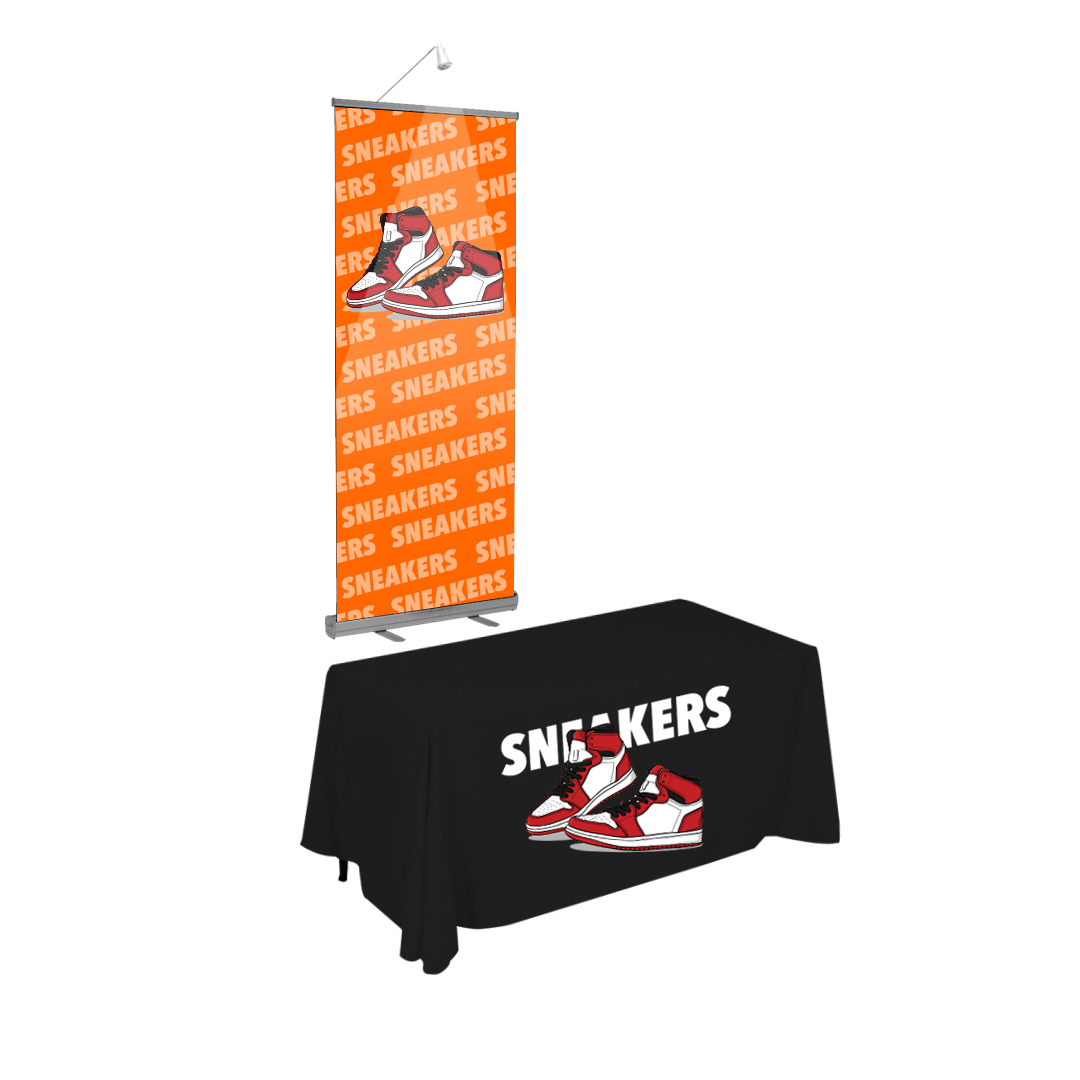 Retractable banner stands are lightweight and economical. Their compact aluminum hardware has two folding feet that rotate out for stability when the stand is on display, and rotate back in for storage in the complimentary carrying bag. The full color graphics come on UV printed fabric inserts with curl free edges and gray blockout backing. Great for traveling, these stands take mere seconds to display and when the show is over the insert is retracted into the hardware for safe keeping. Our standard table cover is a great table topper for trade shows, exhibitions and presentations. Our table covers are dye sublimated and are 100% washable if they ever get dirty. This table cover is made from our 8.8 oz. polyester table fabric sized for a 72″ x 30″ x 30″ display table. The table cover is sewn with rounded corners and hang approximately 2″ above the floor. The back side of this table cover is open keeping the leg area open for sitting exhibitors.