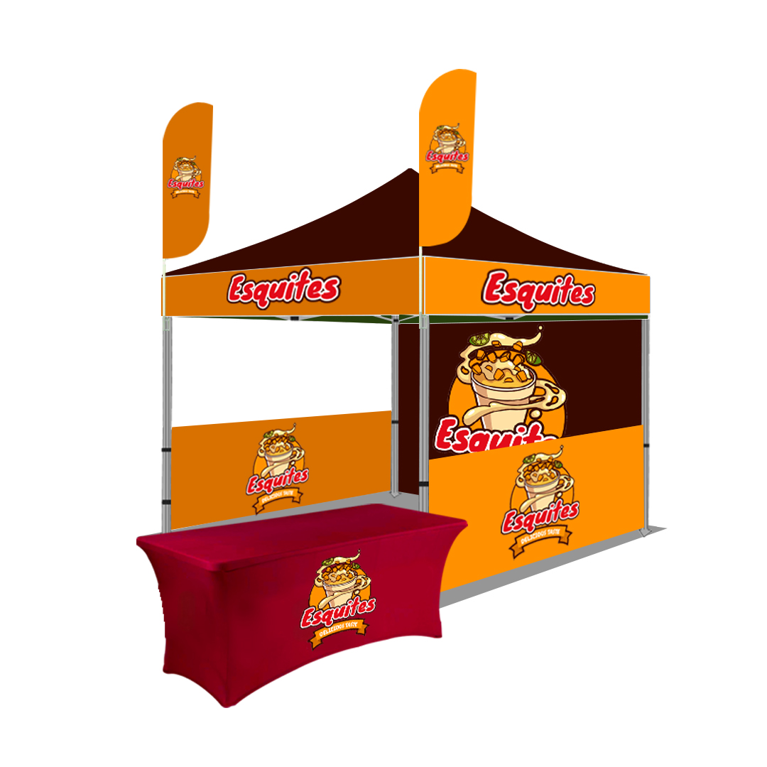 •10' x 10' full color custom tent •Heavy Duty aluminum hex frame •6 oz weatherproof tent fabric - dye sublimated •Optional printed walls and flags •Carry bag included - Premium wheeled bag available •UV printed fabric graphic - curl-free edges •Compact aluminum hardware with two stabilizing feet •Quick setup •Complimentary travel bag. •8.8 oz tension fabric table cover •Full color dye sub •Fits standard 6' tables •Open back for sitting behind table during exhibitions •Closed back for 360 degree table coverage