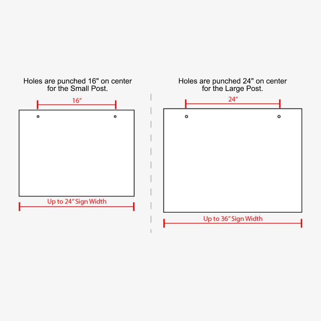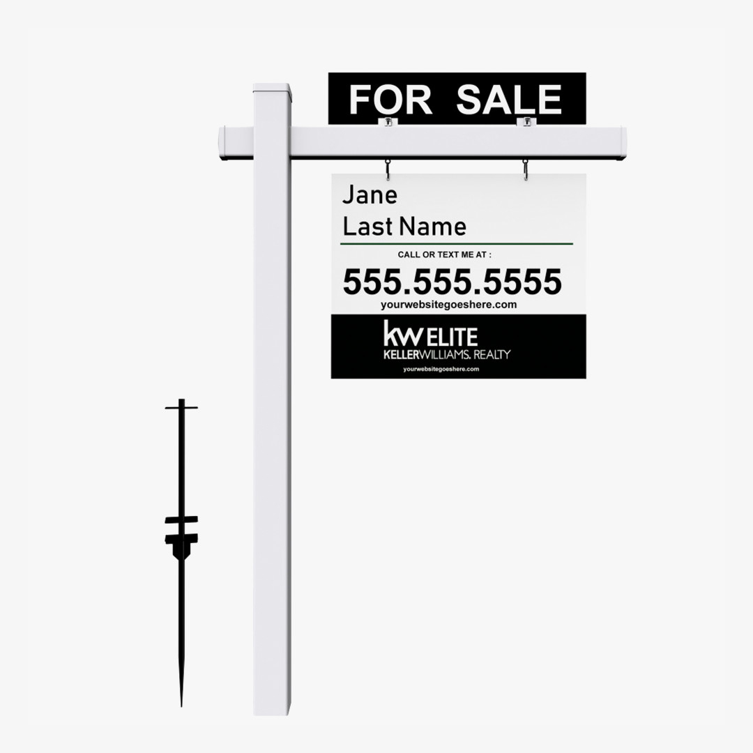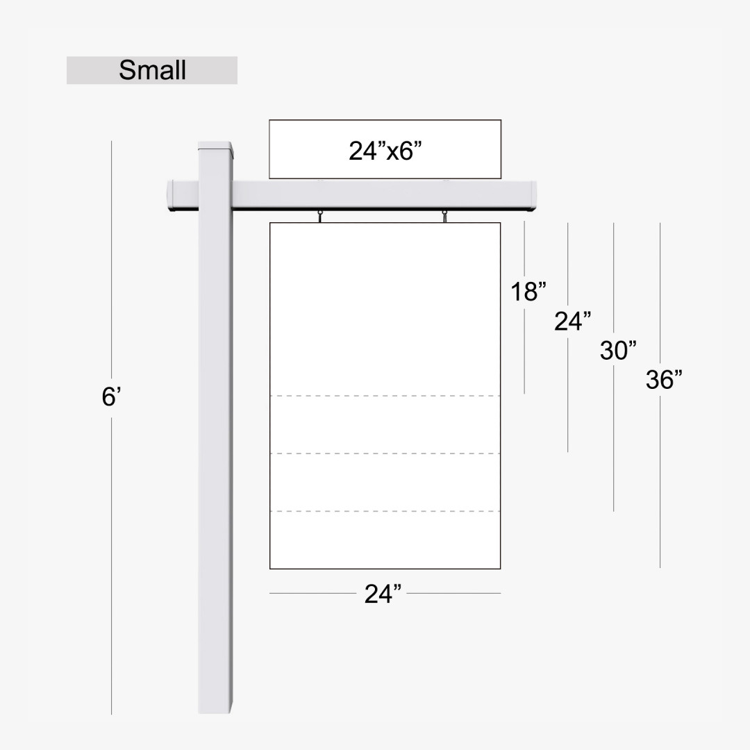 Our real estate posts provide a must have advertising solution for any Realtor. The PVC hardware is durable and lightweight enough for one person installation. The arm, quick-install ground stake, caps and hanging hardware all fit within the body of the vertical post for compact storage and transport. The quick-install ground stake makes displaying the real estate post easy and does not require any digging. No shovel is required. Just hammer the stake into the ground and fit the PVC post over the stake. We offer double sided aluminum sandwich board prints for long lasting outdoor graphics. Sizes available include: 24″ x 18″, 24″ x 36″ for the small post, 36″ x 24″ and 36″ x 48″ for the large post. Optional rider signs are also available in 24″ x 6″ and 36” x 6”. Signs are pre-drilled for hanging from the post arm. Features:
