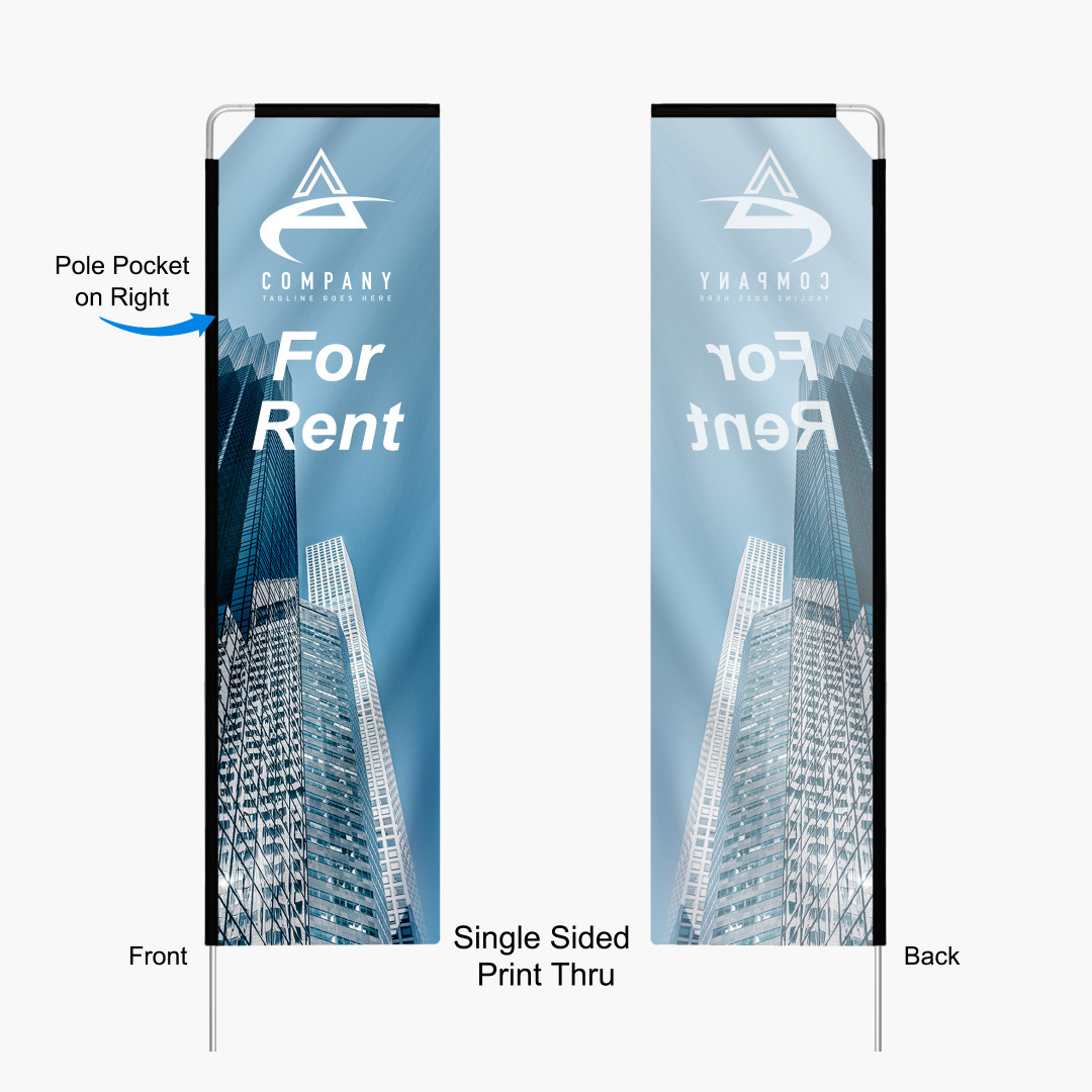 Single sided Print Thru Reverse flag graphic with black nylon pole sleeve to the right of the print when viewed from the front