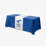 •8.8 oz tension fabric table cover •Full color dye sub •Fits standard 8' tables •Open back for sitting behind table during exhibitions •Closed back for 360 degree table coverage