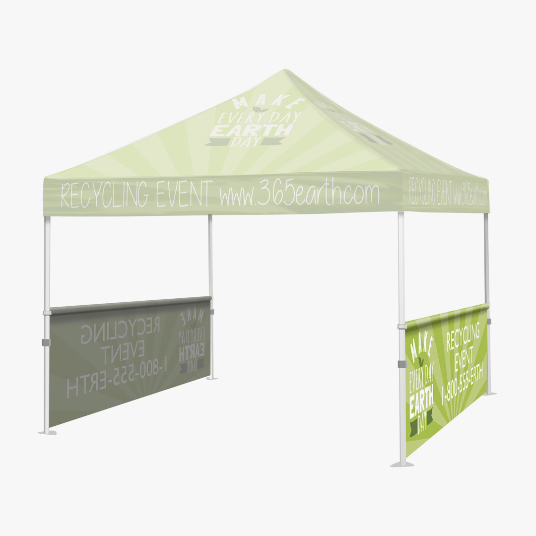 Half wall tent graphics are versatile additions to a 10×10 event tent setup. They add square footage to your branding footprint, drive traffic through your preferred entry point and allow for a modular tent setups. Pick 1,2,3,4 half walls or pair them with the full walls for a complete tent package. The dye-sub graphics are printed on weather-resistant tent polyester.