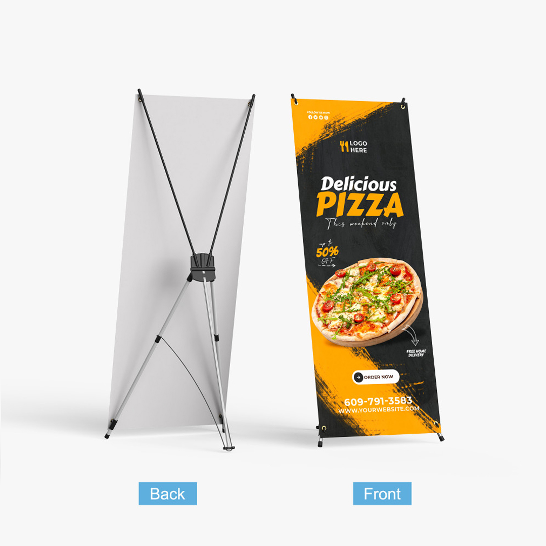 Showcase your promotional banner with the X-stand. It is durable and is the most cost effective display. Stand includes a free nylon travel bag making it easy to carry to trade show exhibits, lobby exhibits, and much more. Since the graphic is installed using grommets there’s no better banner stand product on the market for swapping out graphics.